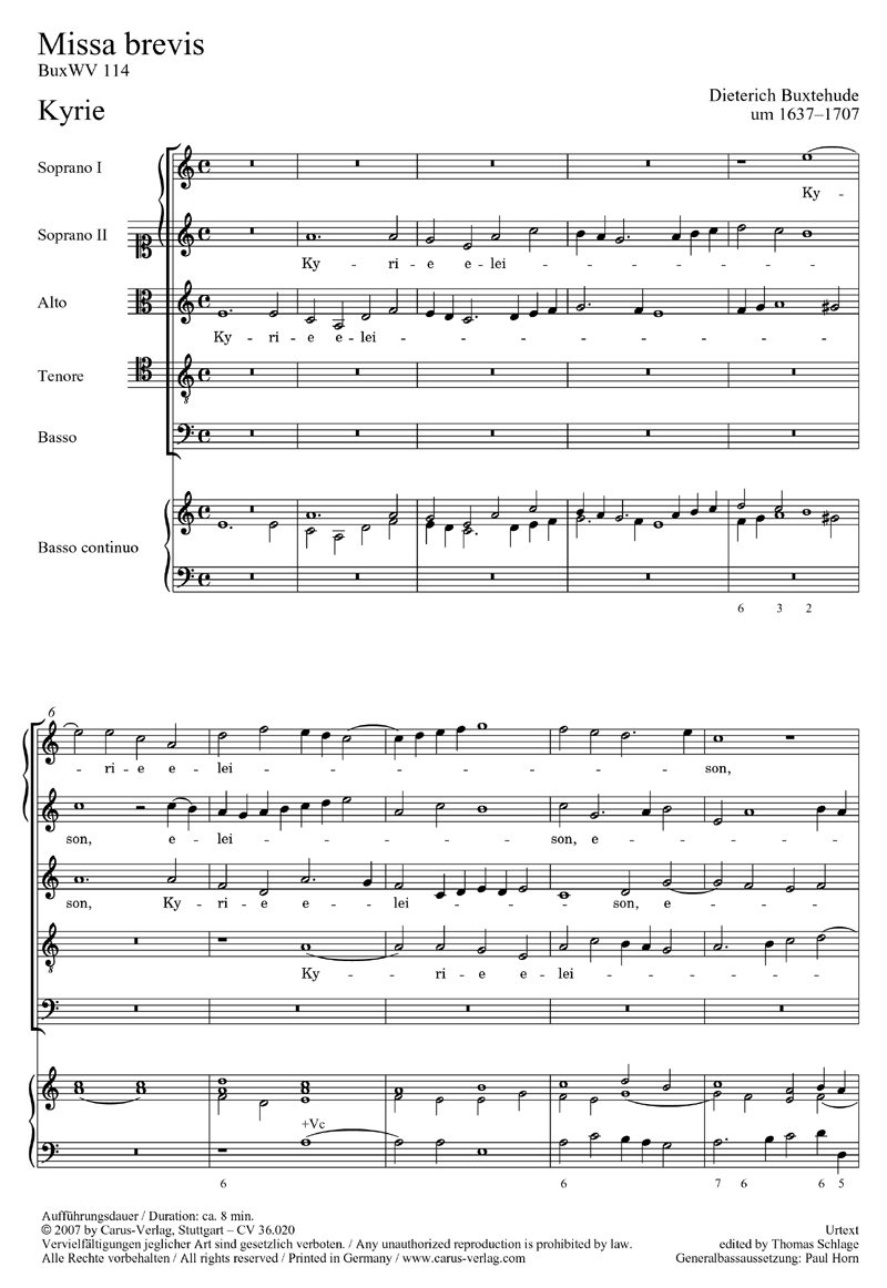 Additional info/contents In der Tradition der protestantischen Missa-brevis-Komposition steht die Vertonung der vorliegenden Messe, die im sogenannten 'stile antico' gehalten ist, der sich an Kompositionsmodellen des 16. Jahrhunderts orientiert und als Palestrina-Stil bekannt ist. Die Abschrift, auch sie liegt in der Düben-Sammlung, entstand im Jahr 1675. Die strenge Form des 'stile antico', kontrapunktische Polyphonie ohne Begleitinstrumente, hat Buxtehude für verschiedene Kompositionen gewählt, die in dieser Zeit entstanden sind, etwa Mit Fried und Freud ich fahr dahin BuxWV 76, die Trauermusik zum Tod seines Vaters. Die Missa brevis umfasst Kyrie sowie Gloria des Ordinariums und ist damit eine 'Lutherische Messe', da im protestantischen Gottesdienst des 17. Jahrhunderts diese Messe-Teile lateinisch vorgetragen wurden.