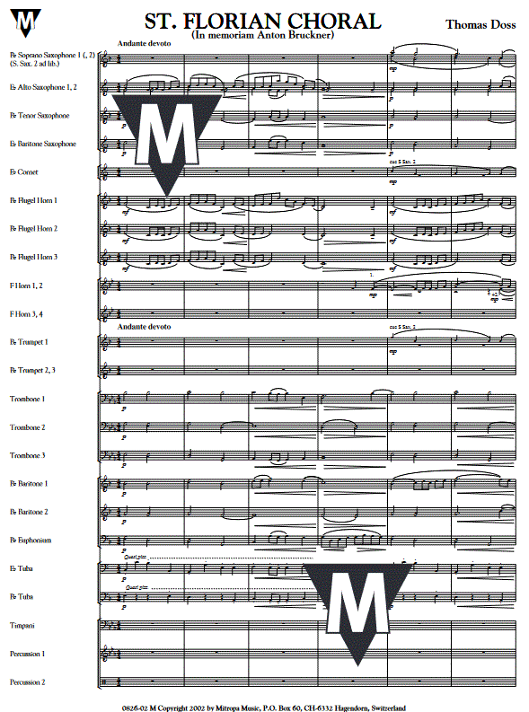 Additional info/contents The successful composer Thomas Doss wrote this impressive chorale as a tribute to his compatriot and role model Anton Bruckner, who wrote many of his unforgotten works in the collegiate church of St Florian. With this tribute, Thomas Doss has created a beautiful piece of music that is a worthy addition to any repertoire.