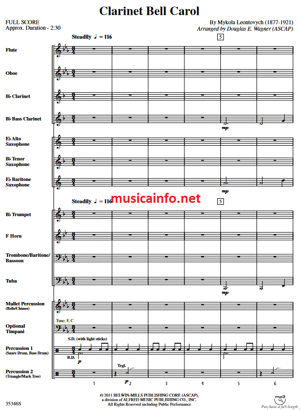 Additional info/contents The original work, scored for unaccompanied choir, was an inspired effort by Ukraine-born composer and educator Mykola Dmytrovych Leontovych. Douglas Wagner's new setting, as the title implies, features your clarinetists giving them a left-handed holiday workout. Very comfortable for the whole band and right in the pocket for the clarinet section, this one will be a hit on your students' very first holiday program!