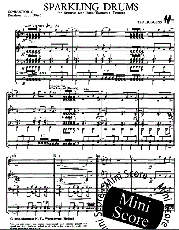 Additional info/contents In the early days of Ted Huggens, few wind bands boasted a complete drum set. Nowadays one could hardly imagine a wind band without such a set. Many drummers all over the world included this spectacular solo in their repertoire.