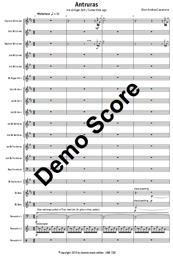 Additional info/contents The composition "Antruras" by Gion Andrea Casanova is a profound composition that creates an impressive connection between nature and the inner state of man. Through the sound palette and the musical structure, the composer manages to capture the interplay between the external environment and the inner experience in an extraordinary way.