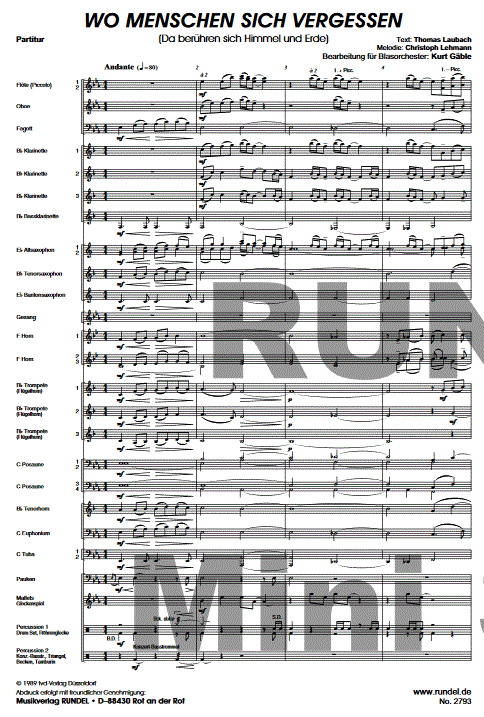 Additional info/contents In the series Neue Geistliche Lieder für Blasorchester, the music publisher RUNDEL publishes modern church songs for Catholic, Protestant and ecumenical occasions. The young and fresh musical approach to faith expressed in these songs reflects the growing cooperation between the two great Christian churches. The wind orchestra plays a major role in the annual cycle of the church congregations and with these New Spiritual Songs can now also musically shape modern worship.