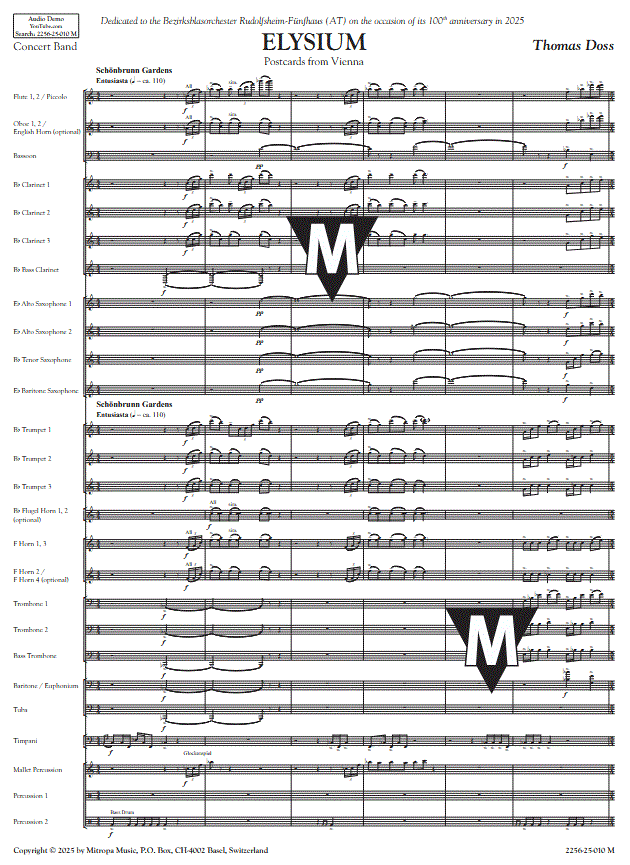 Additional info/contents Vienna has been named "the most livable city in the world" in various international rankings. Reason enough for the composer to title the work "Elysium," the "place of the blessed" according to Greek mythology, and to figuratively send the listener seven different "postcards" from this city. The seven sections of the concert piece are played without interruption. The work begins radiantly and enthusiastically and features many different musical styles.